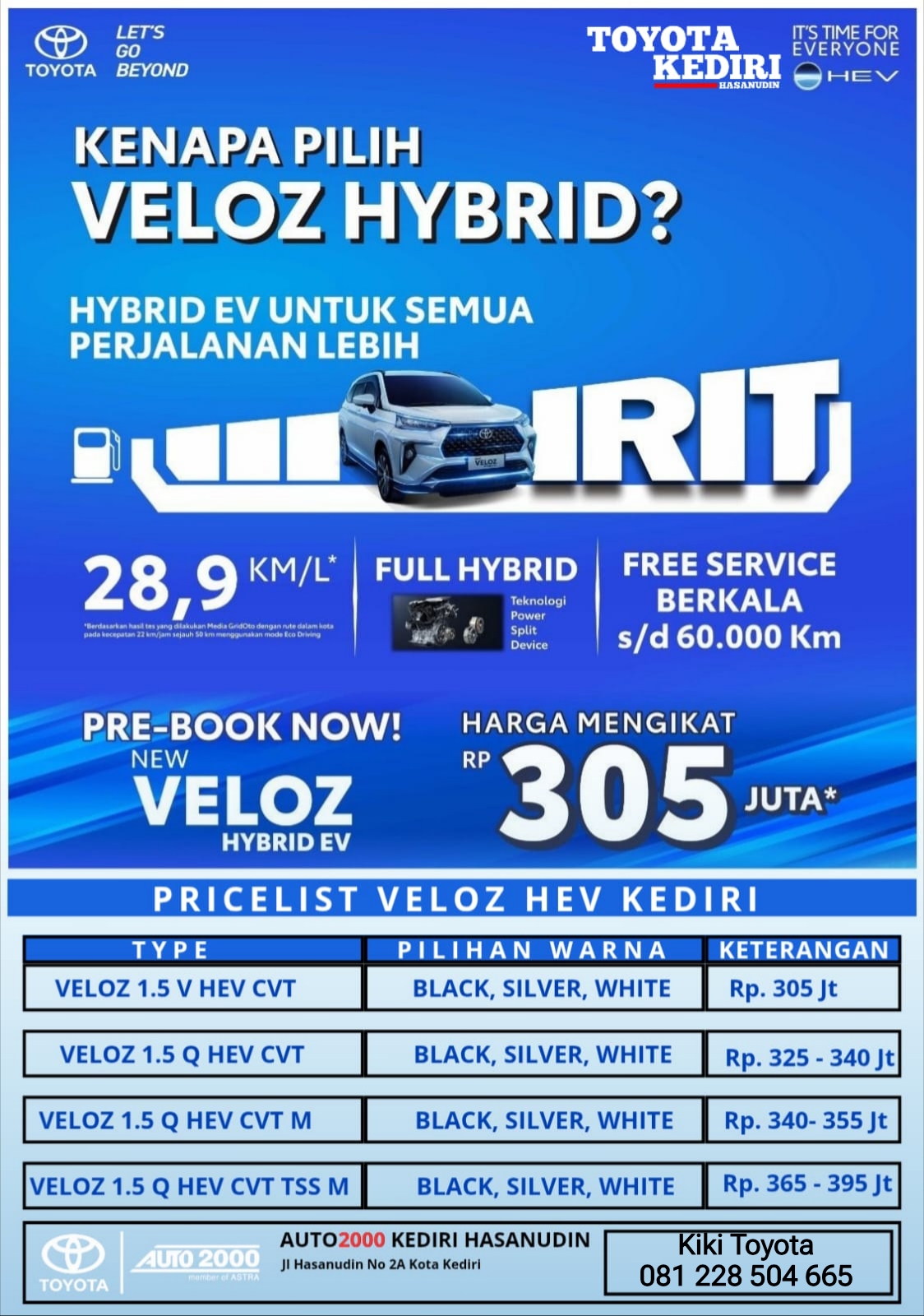 Saya adalah sales Toyota di Dealer Toyota Auto 2000 Kediri. Saya memiliki pengalaman yang cukup lama dalam menjual mobil Toyota dan telah melayani banyak pelanggan dengan baik. Saya selalu berusaha untuk mendengarkan kebutuhan pelanggan dengan baik dan memberikan solusi terbaik untuk memenuhi kebutuhan mereka. Saya juga akan memberikan saran yang jujur dan membantu Anda untuk memilih mobil yang paling sesuai dengan kebutuhan dan anggaran Anda. Saya sangat ahli dalam menjelaskan fitur dan manfaat dari mobil Toyota dan siap untuk menjawab semua pertanyaan yang Anda miliki. Jangan ragu untuk menghubungi saya jika Anda ingin membeli mobil Toyota